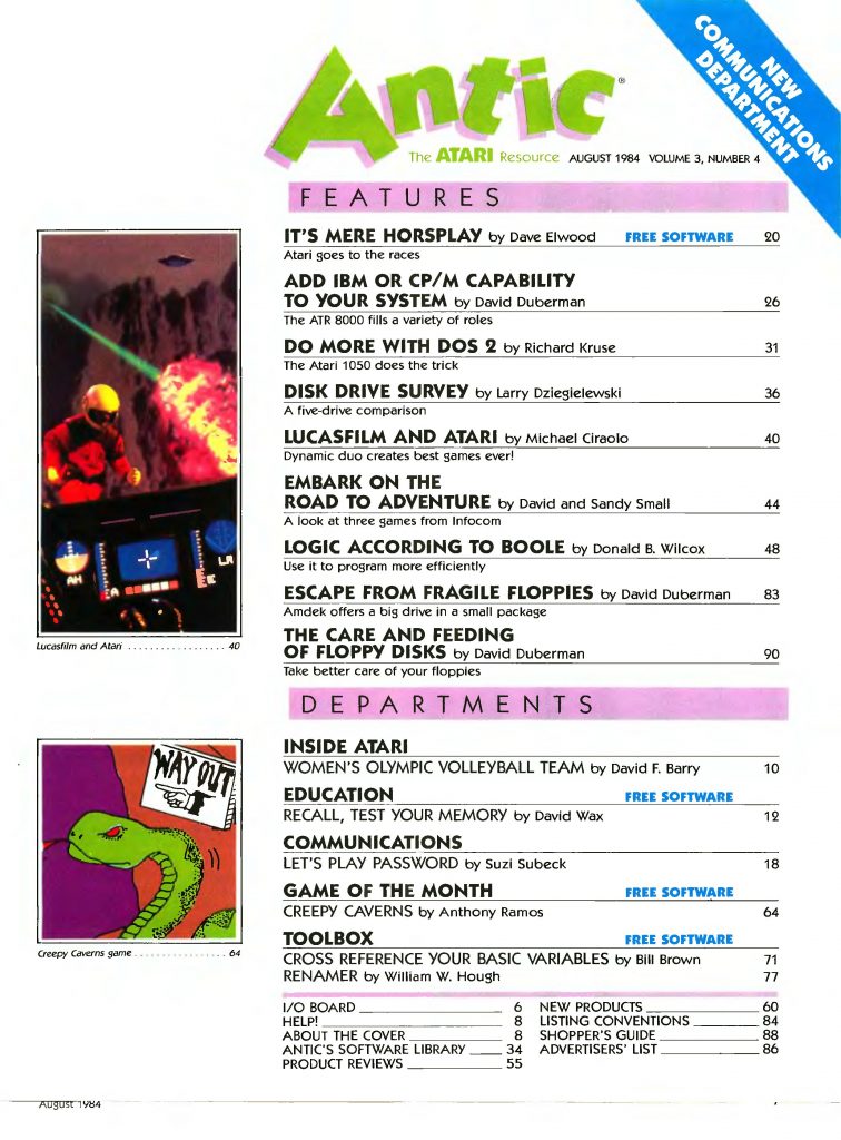 Antic was one of the two major Atari 8-bit magazines in the U.S. (the other being ANALOG). Antic also had some coverage of the Atari ST though 1984 was before that. The August 1984 issue includes: