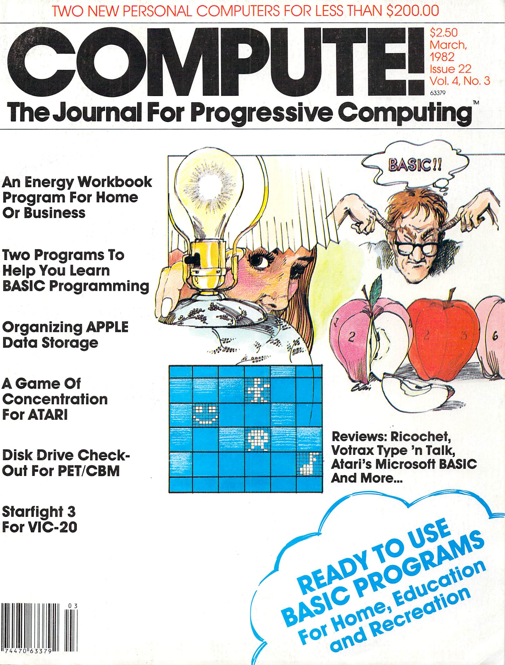 Source: Compute! - March 1982 Compute! was an early multi-format computer magazine that prospered from the early 1980s until the early 1990s. In 1982, computers such as the Commodore PET, VIC-20, Atar...