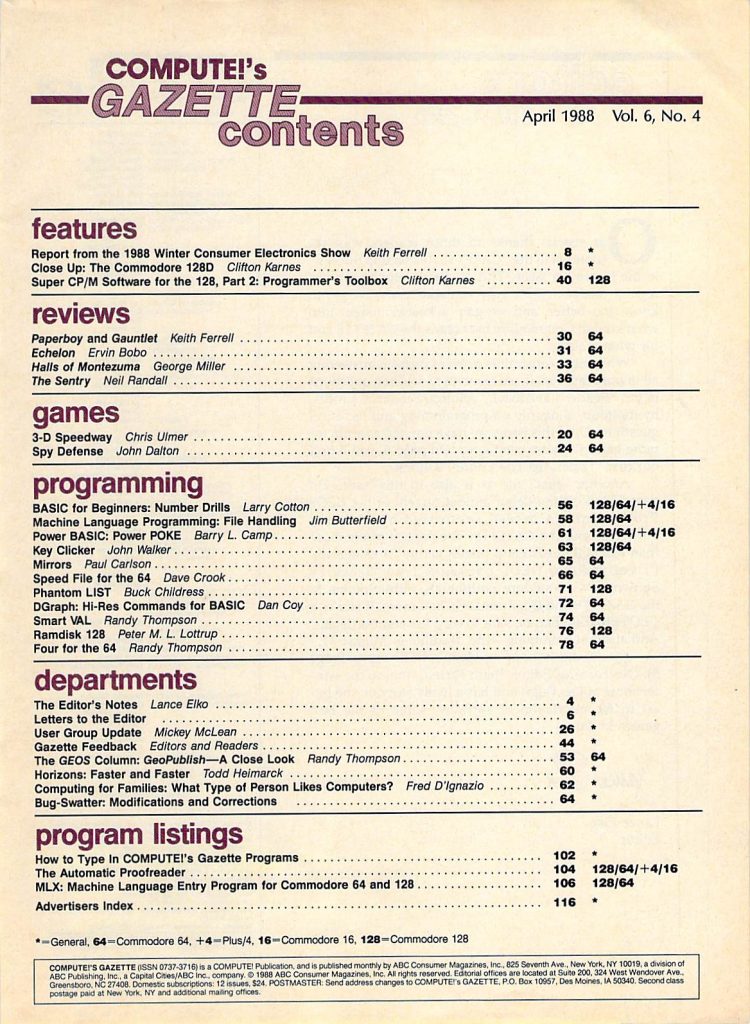 Compute!’s Gazette (April 1988) Posted on November 13, 2025 3:23 pm by Azrael Comment 📂This entry was posted in Commodore 64 Computer Arcana 📎and tagged commodore Commodore 128 Commodore 64 computers retrocomputing