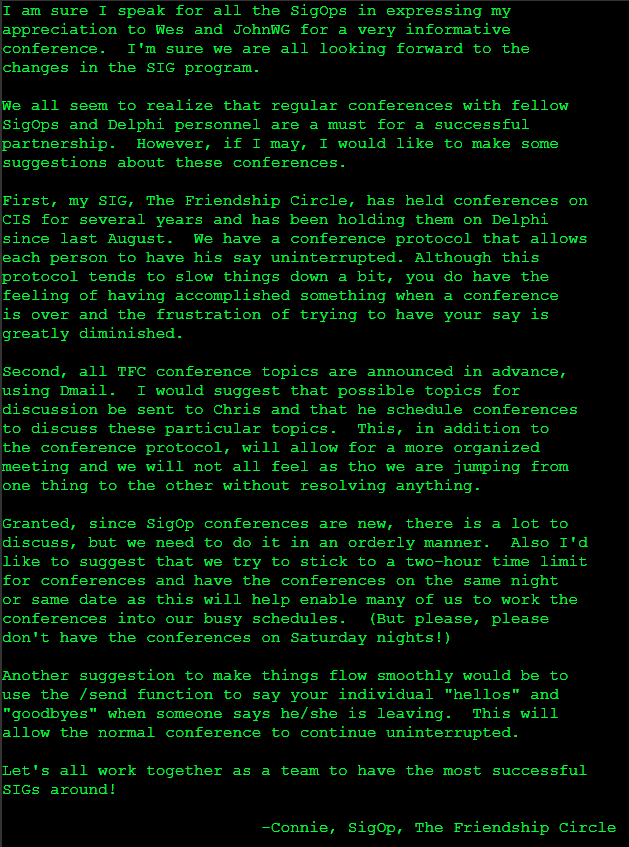 This post includes the contents of PROT.DOC. This is a set of rules to be followed to participate in a conference or group chat that occurred every Saturday on Delphi in the Friendship Circle Special Interest Group (SIG). I guess there would be a specific topic each week and, based on the description here, it seems like it would be pretty heavily moderated. This message includes all the commands you can use during the conference.