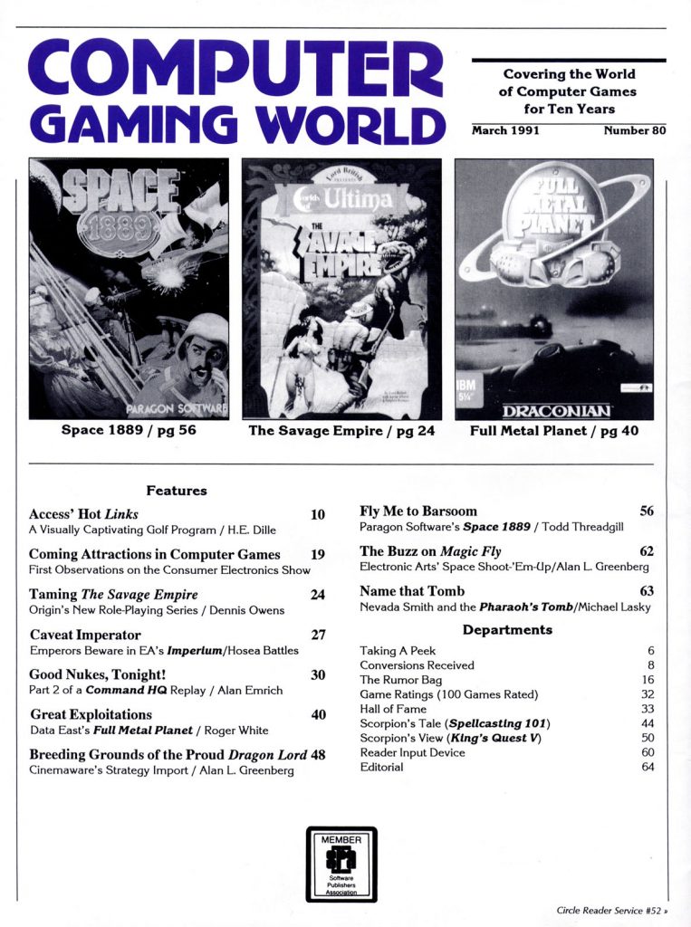 Computer Gaming World was the best computer gaming magazine for the years it was around (which was quite a few). It covered games on a variety of computers over the years, not just IBM PC Compatibles. It eventually became Games for Windows and though the content was much the same, it didn’t survive for long in that form. The March 1991 issue of Computer Gaming World includes: