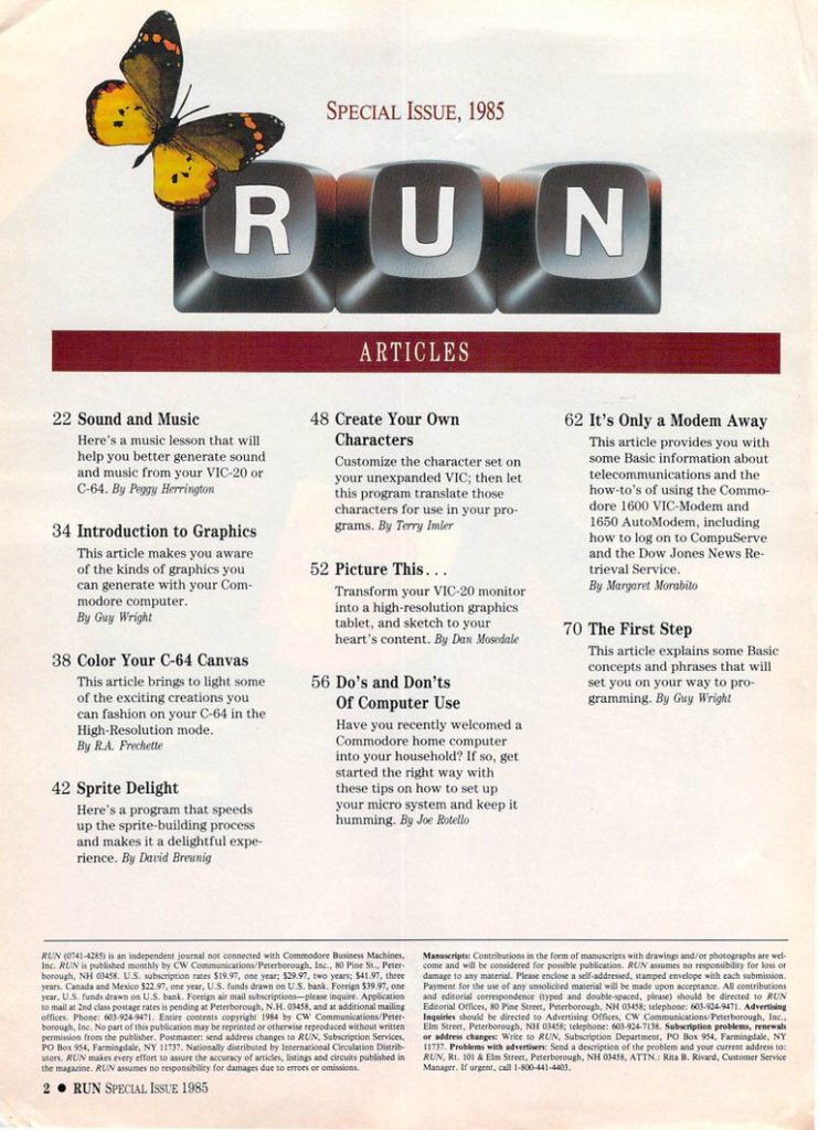 RUN covered Commodore’s 8-bit computer line, primarily the Commodore 64. I bought this magazine regularly starting a few years later, especially after Commodore stopped publishing Commodore Magazine. This was the 13th issue so it would have been published sometime between December 1984 and January 1985. I guess they were selling enough issues at that time to justify publishing an extra bonus issue around the holidays. This issue includes: