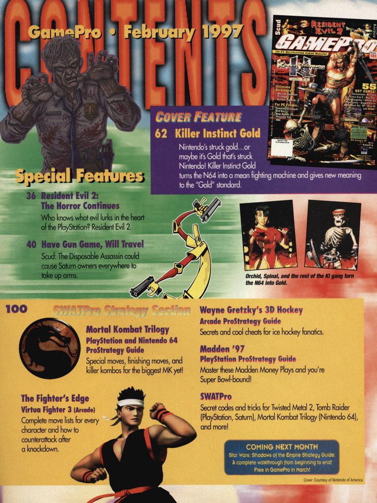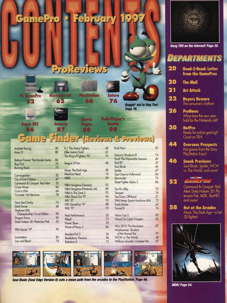 Along with Electronic Gaming Monthly, GamePro was one of the most popular gaming magazines for a long time. In 1997 is was primarily covering the Nintendo 64, PlayStation, and Sega Saturn and was also still covering the Super NES, Sega Genesis and Neo Geo. It also had a little PC and arcade coverage. The February 1997 issue includes: