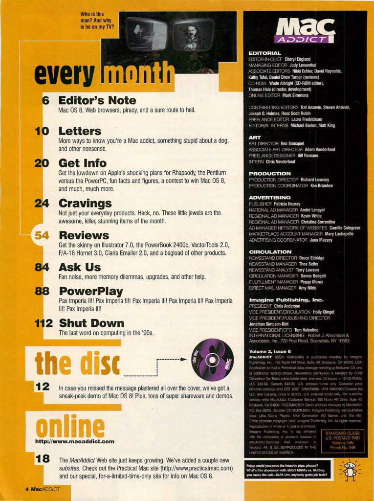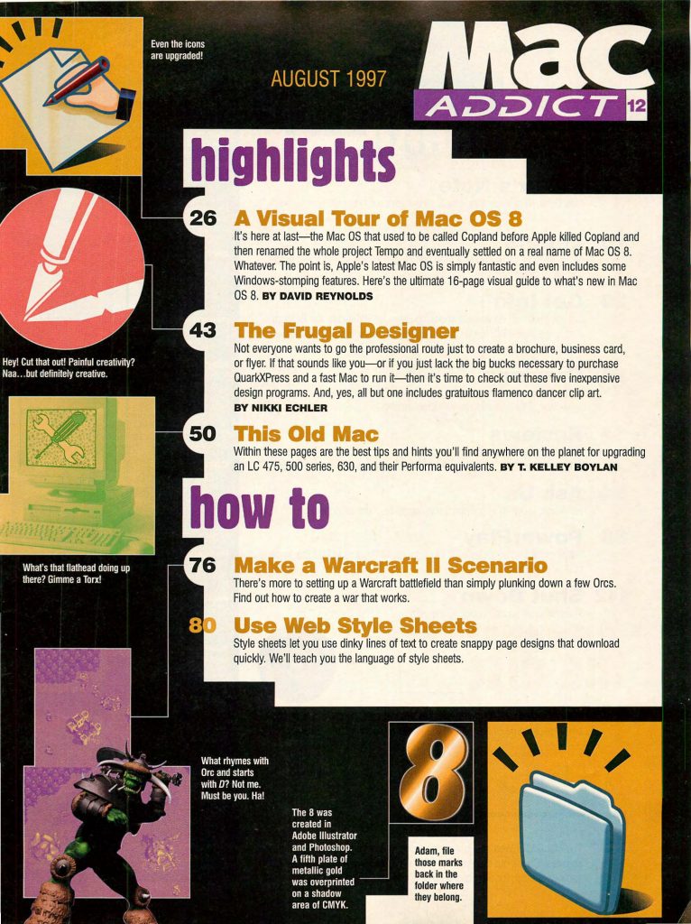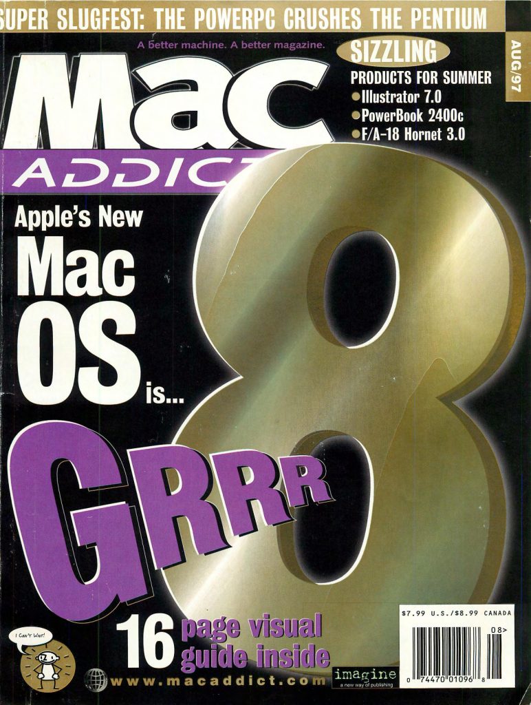 have always thought of MacAddict as a Mac version of boot/Maximum PC. It was a great magazines for Mac fans though in my opinion that changed when they became MacLife. The mid 90s was not a great time for Apple in general. This magazine hit the stands only a couple of months before Steve Jobs returned to Apple and a little over a year before the original iMac was released and really started turning Apple around. The August 1997 issue of MacAddict includes: