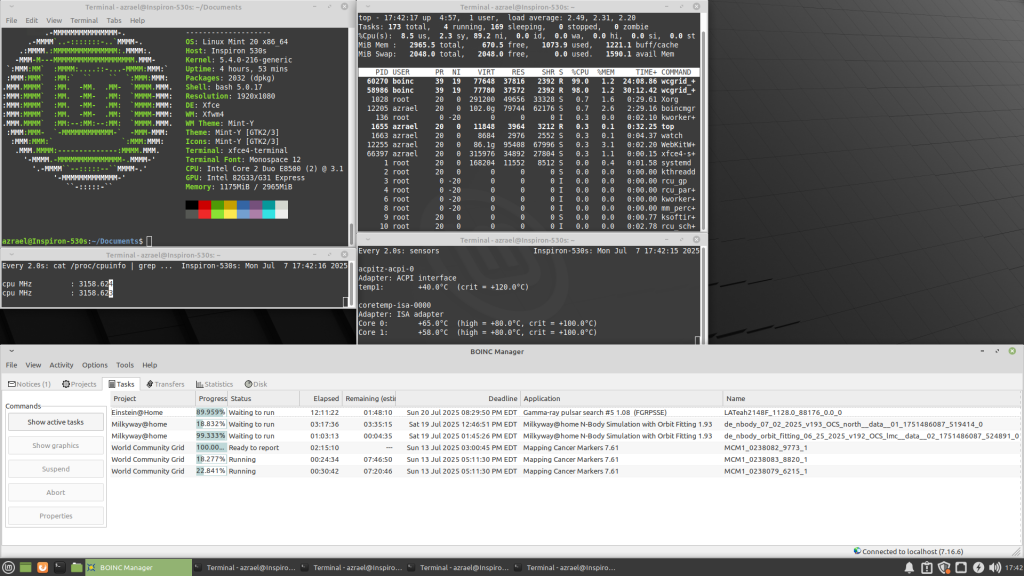 Like all the machines I use, this one has BOINC installed and connected to various projects including Einstein@home, Asteroids@home, MilkyWay@home, Rosetta@home, and World Community Grid. You can see how it is doing at FreeDC.