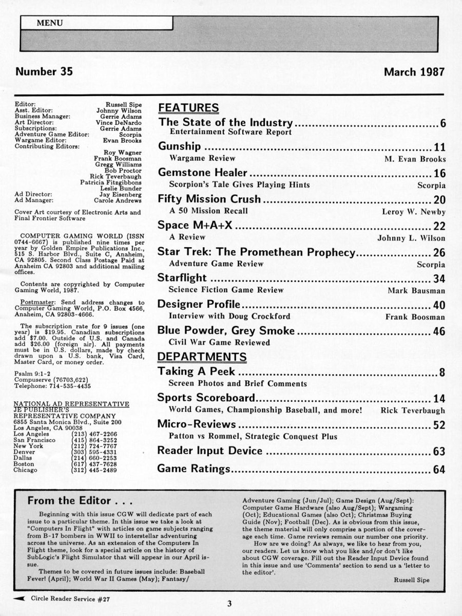 Source: Computer Gaming World - Issue Number 35 - March 1987 While I didn't really start reading it until the early 1990s, Computer Gaming World was by far my favorite computer gaming magazine. Eventu...