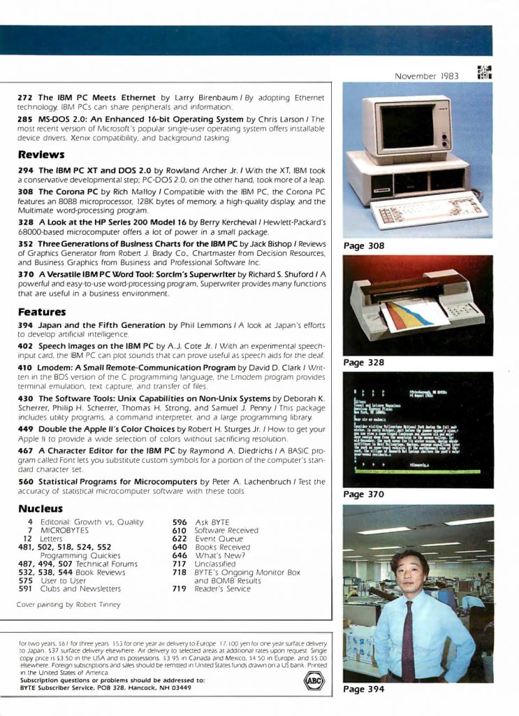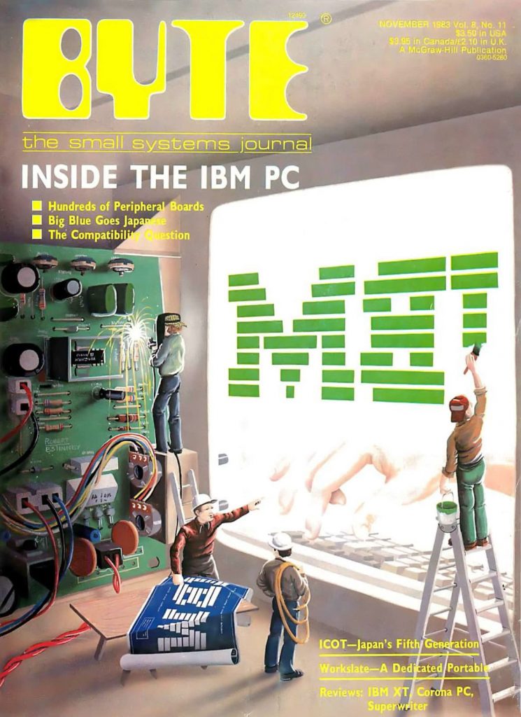 Byte was subtitled “The Small Systems Journal” and it generally covered computers that were used at home or in a business environment. In the early 1980s, there was a wide variety. In November 1983, it wasn’t yet quite clear that the standard set by IBM for the PC would be the one to dominate though it was definitely starting to take hold. In fact, this issue focuses on the PC and includes: