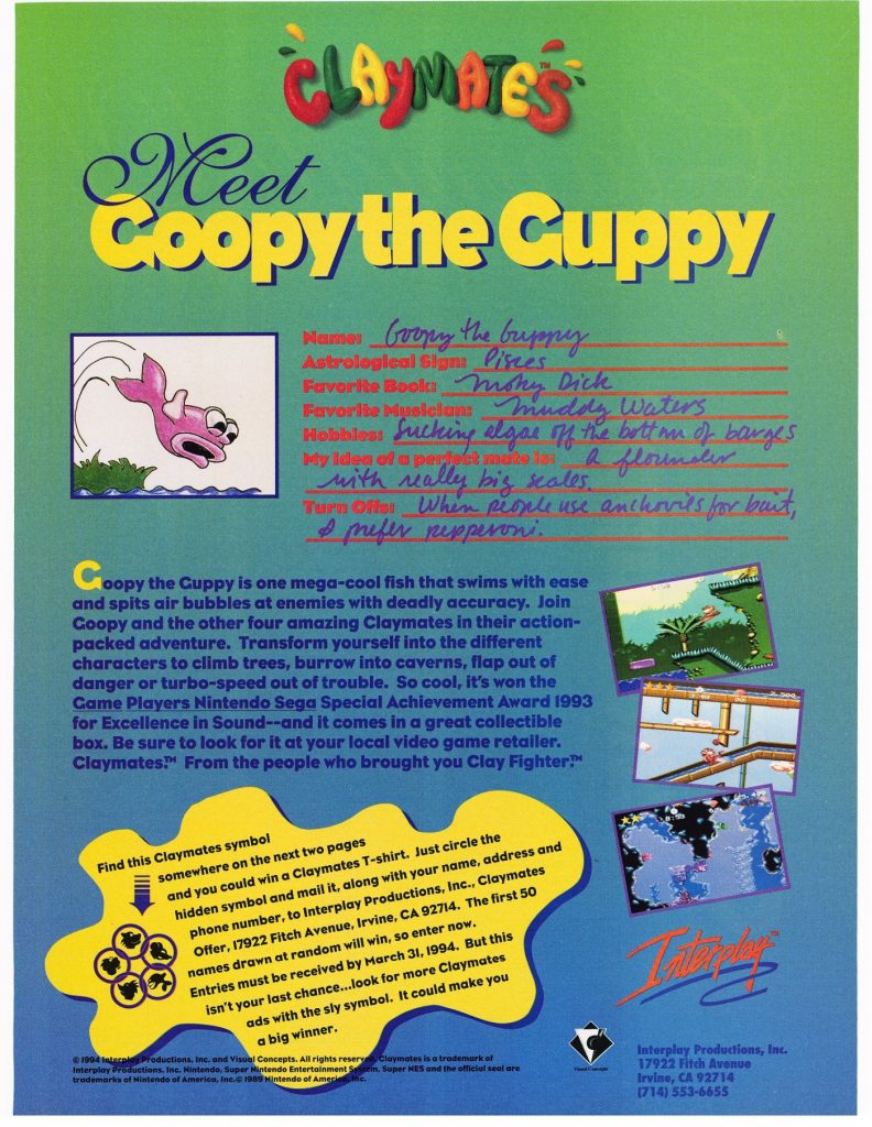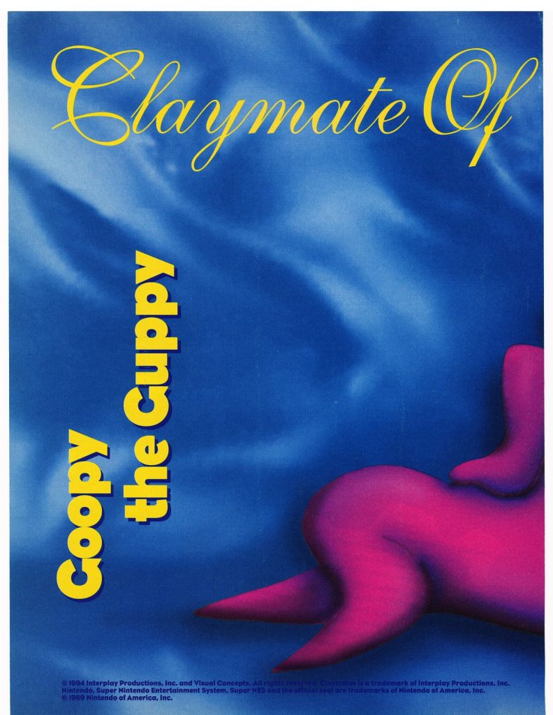 This game follows the same general formula as most other side-scrolling platform games of the time. Run and jump avoiding obstacles and defeating or avoiding enemies along the way. The unique play mechanic in this game is the fact that the main characters is a ball of clay that can transform into one of four animals. These include Muckster the Cat, Doh-Doh the Duck, Oozy the Mouse, Goopy the Guppy, and Globmeister the Chipmunk. The ad here features Goopy the Guppy leaving me to wonder if there were ads for all of the animals. In any case, each animal has its own special abilities that will help you in different situations.