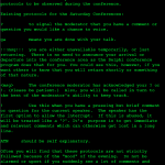 The conference moderator has acknowledged your ? or !. (Please be patient.) Also, you will be called in turn to the best of the moderator's ability to keep track. ! Use this when you have a pressing but brief comment or question for the current speaker. The speaker has the first option to allow the interrupt. If this is abused, it will be treated like a '?'. It's purpose is to get immediate and relevant comments which can otherwise get lost in a long line. ATN should be self explanatory. Often you will find that these protocols are not strictly followed because of the "mood" of the evening. Do not be alarmed or upset if you suddenly see a lot of comments and then have the conference moderator (JohnMyself) call for ATN! We do try to follow the protocols as outlined in fairness to all, but being human, we do get carried away at times! As a matter of common courtesy, please keep side comments and /send messages to a minimum. Thank you. .el