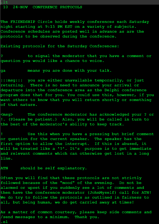 —.lt 10 24-NOV CONFERENCE PROTOCOLS The FRIENDSHIP Circle holds weekly conferences each Saturday night starting at 9:15 PM EST on a variety of subjects. Conference schedules are posted well in advance as are the protocols to be observed during the conference. Existing protocols for the Saturday Conferences: ? to signal the moderator that you have a comment or question you would like a chance to voice. ga means you are done with your talk. :::msg::: you are either unavailable temporarily, or just returning. There is no need to announce your arrival or departure into the conference area as the Delphi conference program does that for you. You could use this, however, if you want others to know that you will return shortly or something of that nature.